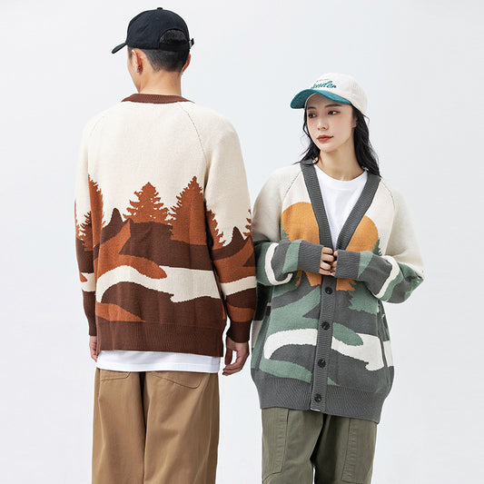 Herren-Strickjacke mit V-Ausschnitt und Waldlandschafts-Print im Freien