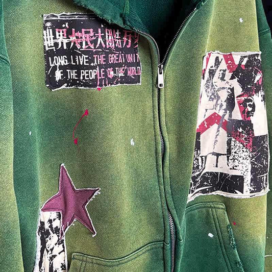 Niche Affixed Cloth Embroidered Handmade Unique Washed Old Hooded Sweater Cardigan