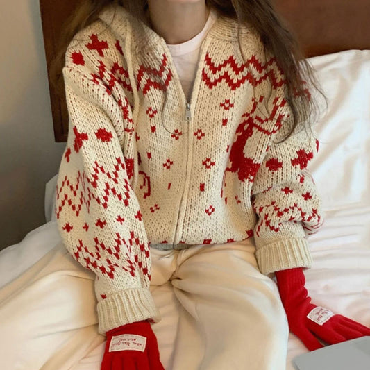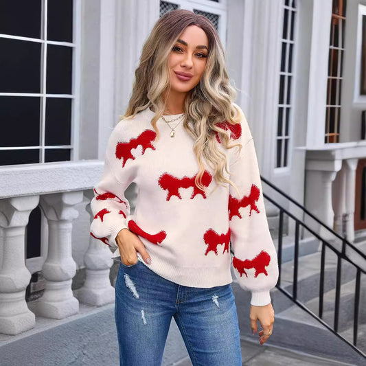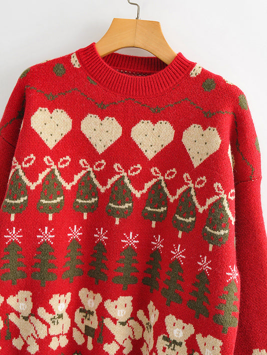 Weißer Pullover mit Bären-Jacquard-Strickwaren für Damen