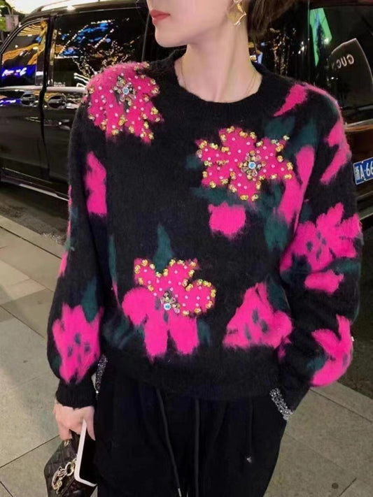 Damen Strickwaren Dreidimensionales Beflockungsblumenrevers