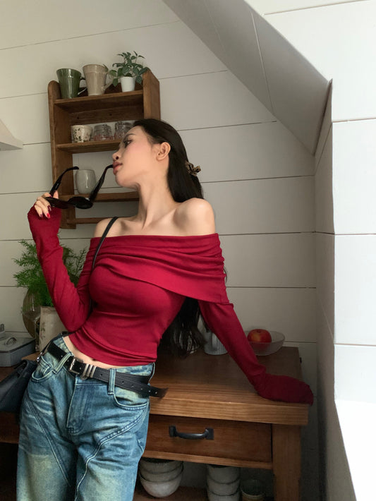 Vintage One-Shoulder Langarm-Strickwaren für Damen