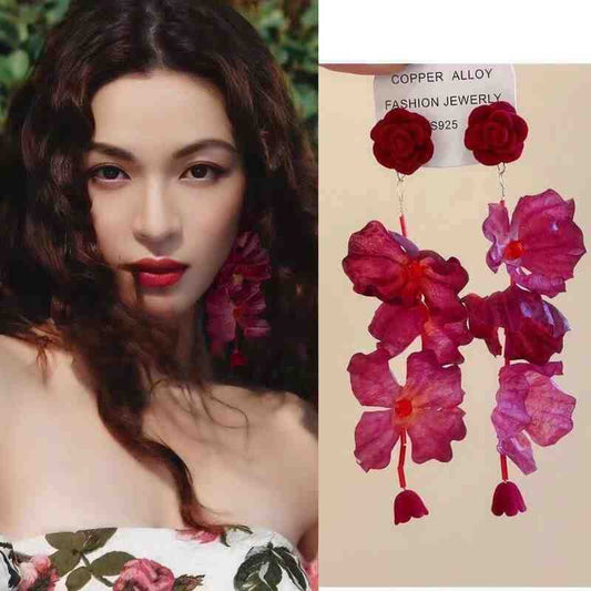 Pendientes largos de moda con rosas de tela