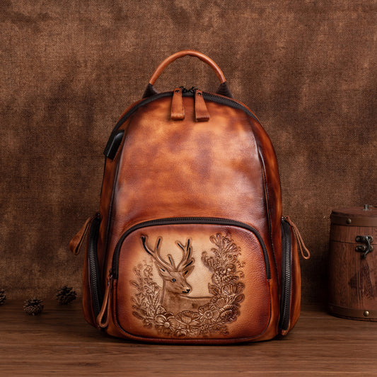Mochila retro pulida de piel de vaca con diseño personalizado de cabeza de ciervo