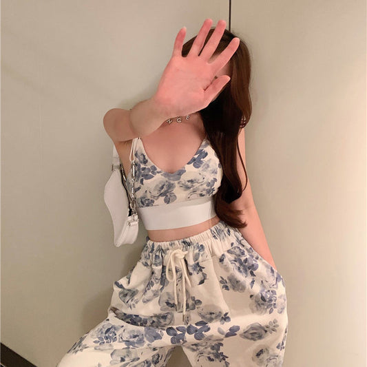 Traje para mujer estilo Hong Kong, diseño de pantalones de pierna ancha y top con tirantes.