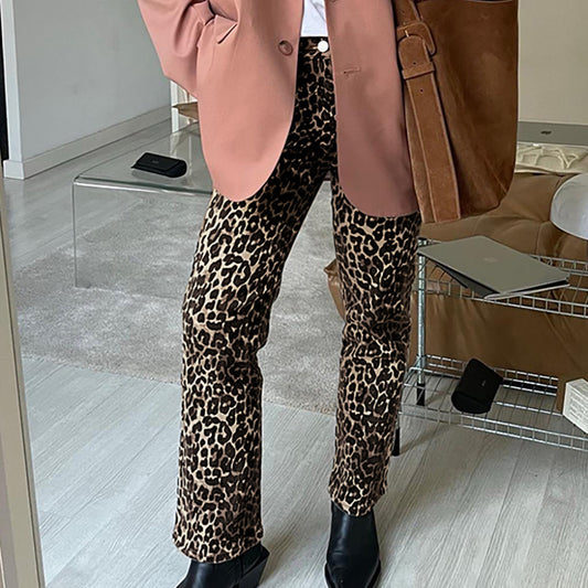 Pantalones rectos de cintura alta con estampado de leopardo, pantalones elegantes retro para mujer