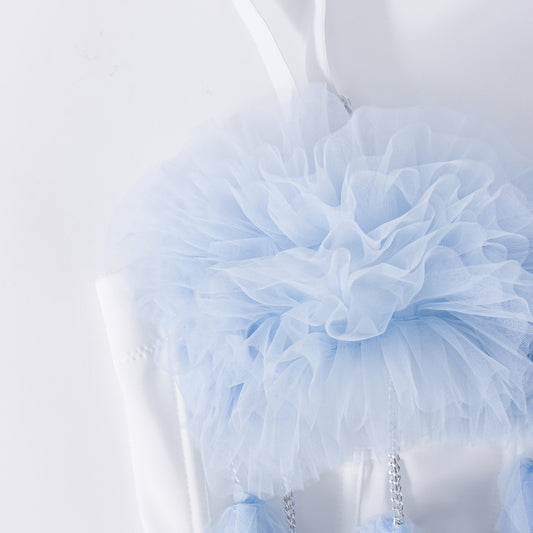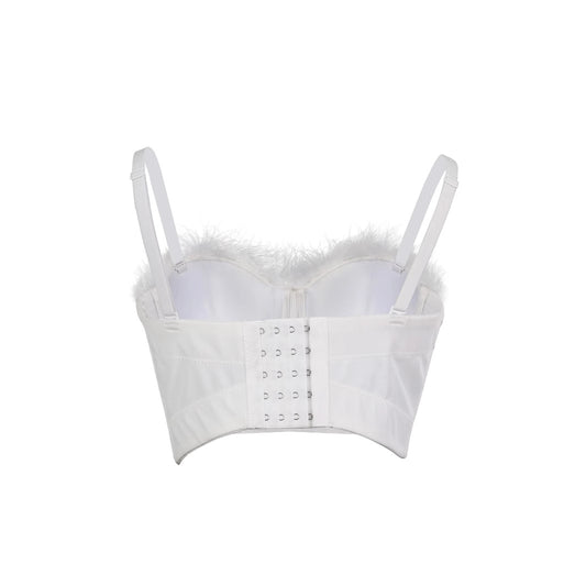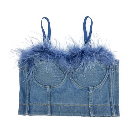 Top sin tirantes con corsé de mezclilla y almohadillas incorporadas. Bralette de plumas dulce y picante.
