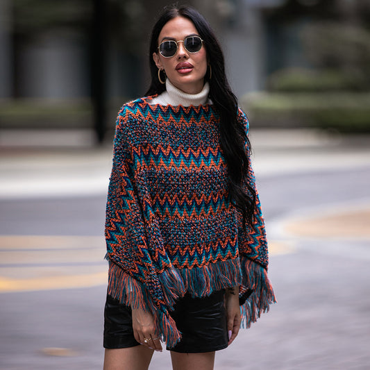 Suéter de punto con cuello en V, tipo capa, de sarga, a cuadros, con borlas y chal