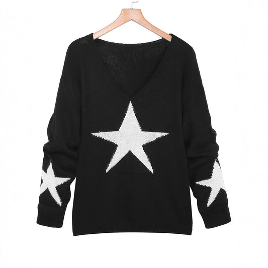 Suéter informal holgado de manga larga con cuello en V y estrella de cinco puntas