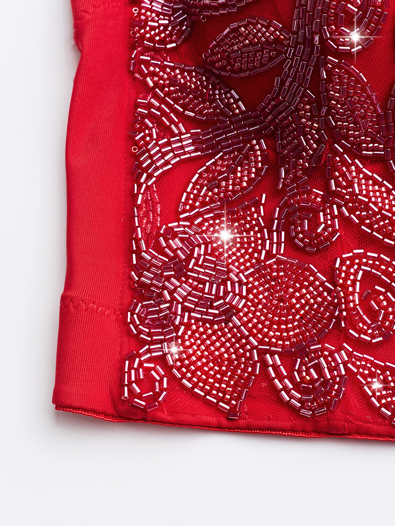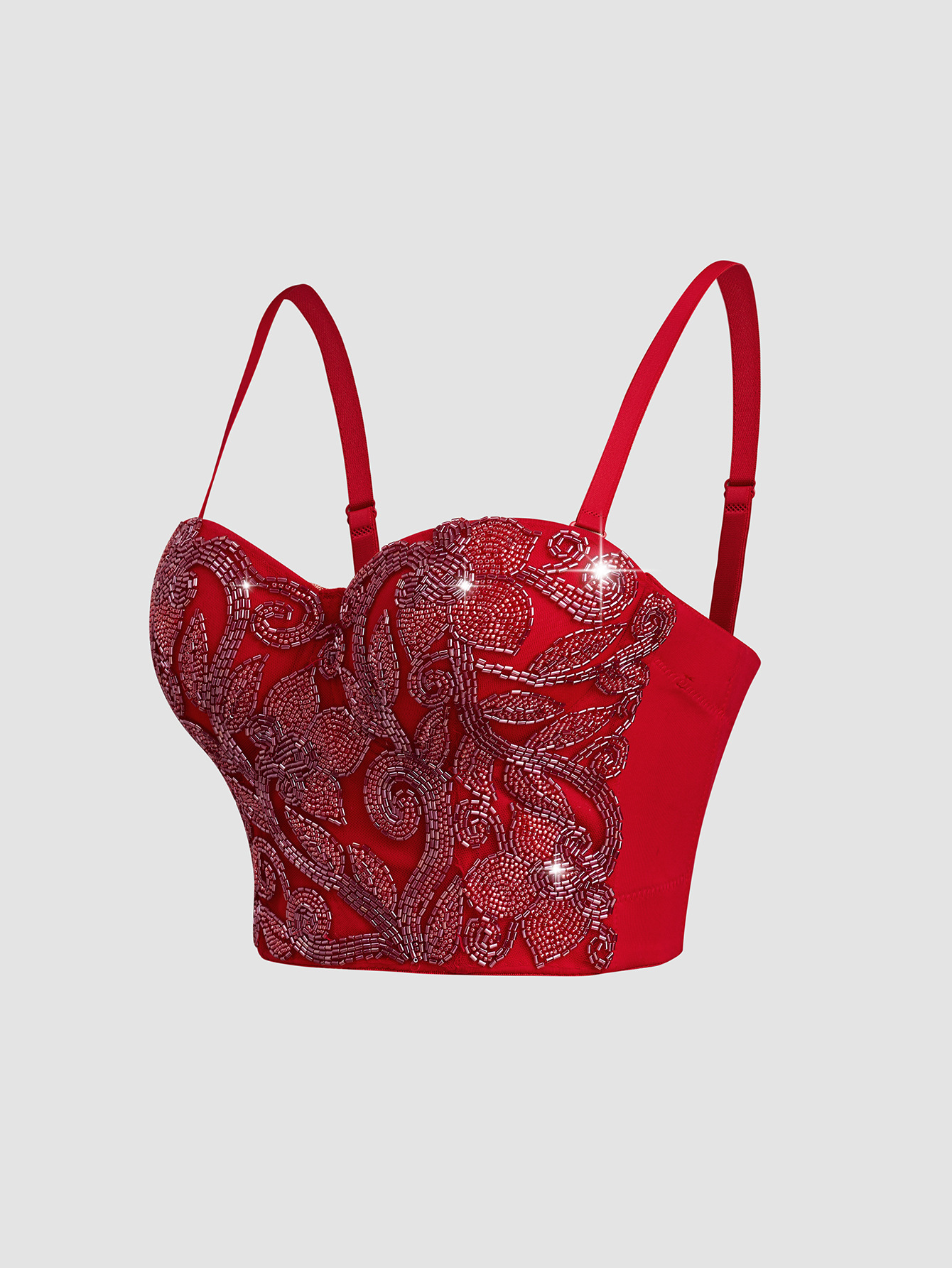Elastic Red Bone Chest Support Sequin Embroidered Strap Camisole