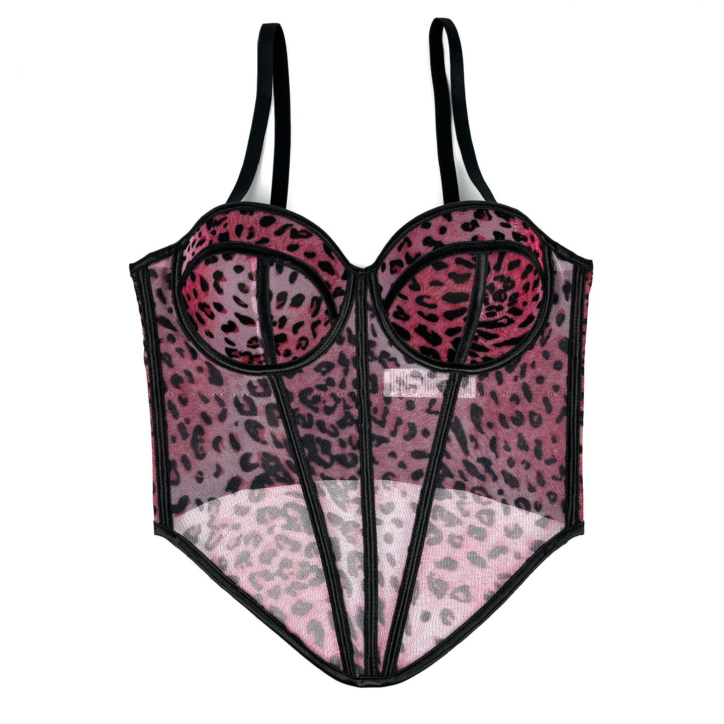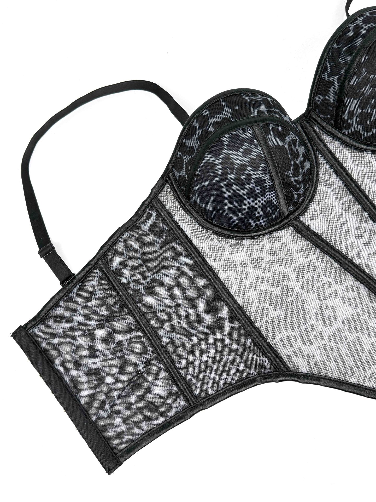 Sexy Leopard Print Splicing Bralette with High-End Mesh Lace Sheer Outerwear Boned Bustier